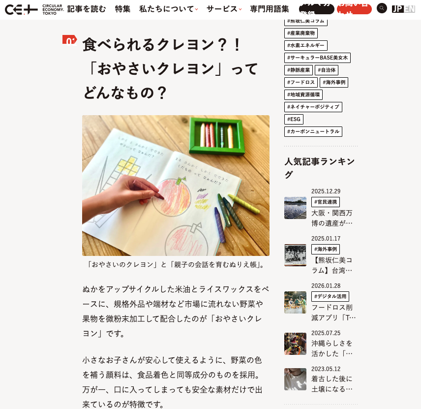 当社の人気商品「おやさいクレヨン」が、サステナビリティの実践とアップサイクルの優れた事例として、専門メディア TOKYOサーキュラーエコノミーアクション(サーキュラーエコノミー東京) にて2026年2月に掲載されました。