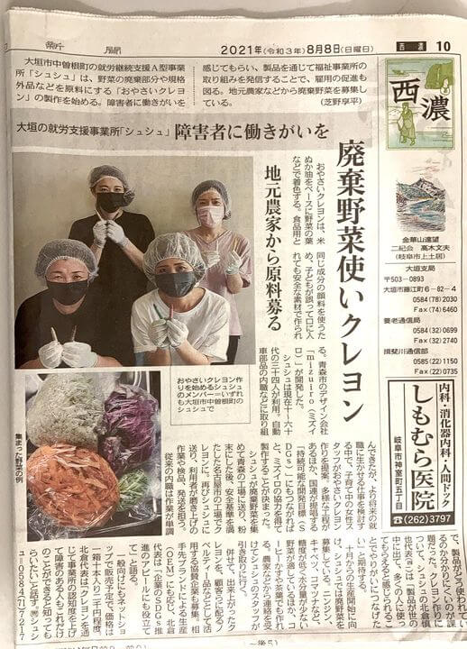 岐阜県大垣市にて就労継続支援A型事業所「シュシュ」を運営する、株式会社セスタと弊社との協業プロジェクトについての記事が中日新聞 西濃版へ掲載頂きました。